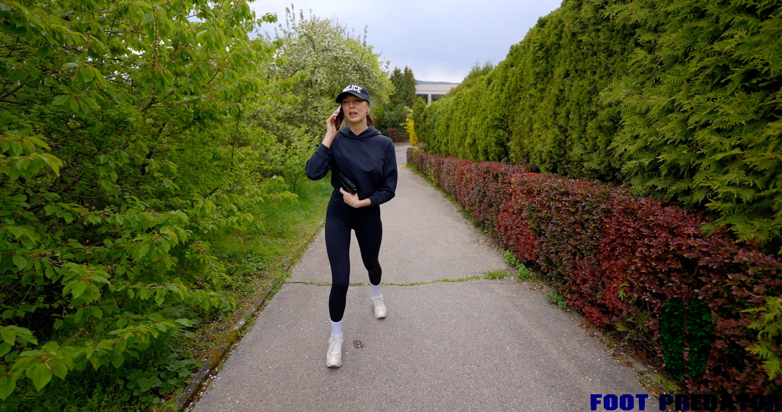 Isabella is a police officer. Her badge is in her coat pocket, and she carries a handgun and handcuffs on her back. She’s wearing a sports jacket, sports bra, and yoga pants(Yoga pants that extend under the soles of the feet)