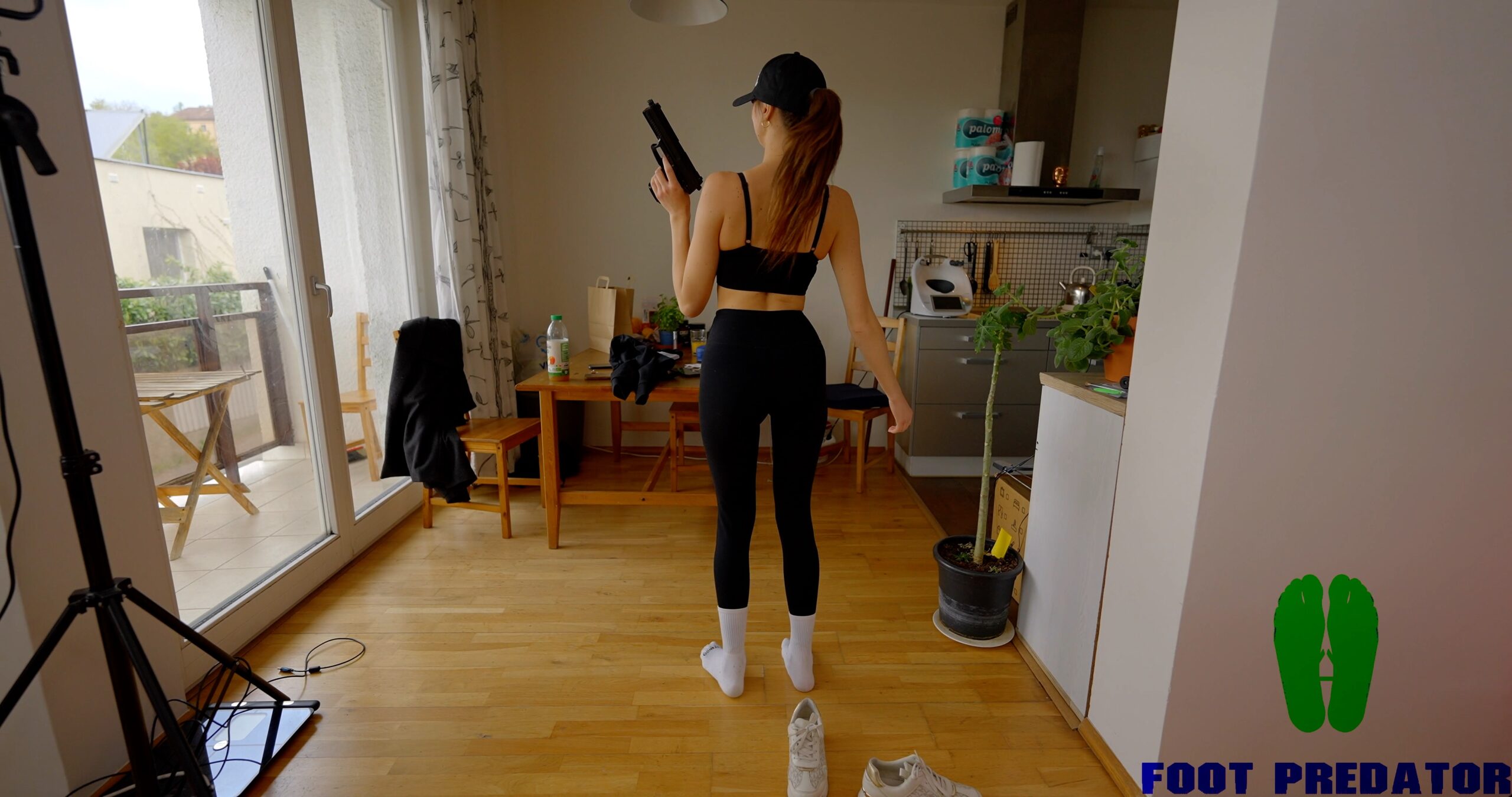 Scene 6 (approx. 20 minutes): You handcuff her hands behind her back and engage in foot sex with her. The starting position is as follows: Isabella lies flat on her stomach with her legs raised, creating a foot-sex posture in which your penis rubs back and forth between her yoga pants and the soles of her feet. During this process, she wakes up, screams in terror for help, and says she will arrest you. You remove her socks and stuff them into her mouth, . Because she struggles so violently, you tie her feet and two big toes (if you have another pair of handcuffs, use them to cuff her ankles; if not, tie them with something else). Must include the following footjob scenes.